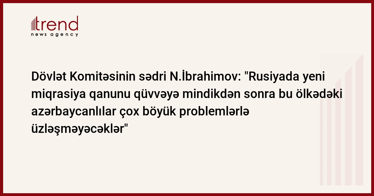"Rusiyada miqrasiya ilə bağlı yeni qanun və prezidentin sərəncamı qüvvəyə mindikdən sonra bu ölkədə yaşayan azərbaycanlılar o qədər də böyük problemlərlə üzləşməyəcəklər". Trend in məlumatına görə, bu fikirləri jurnalistlərə açıqlamasında Xarici Ölkələrdə Yaşayan Azərbaycanlılarla İş üzrə Dövlət Komitəsinin sədri Nazim İbrahimov bildirib.