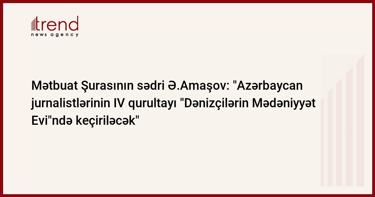 Dekabrın 23-ə təyin olunan Azərbaycan jurnalistlərinin dördüncü qurultayının keçiriləcəyi yer müəyyənləşib. Bu barədə Trend ə Azərbaycan Mətbuat Şurasının sədri Əflatun Amaşov məlumat verib.