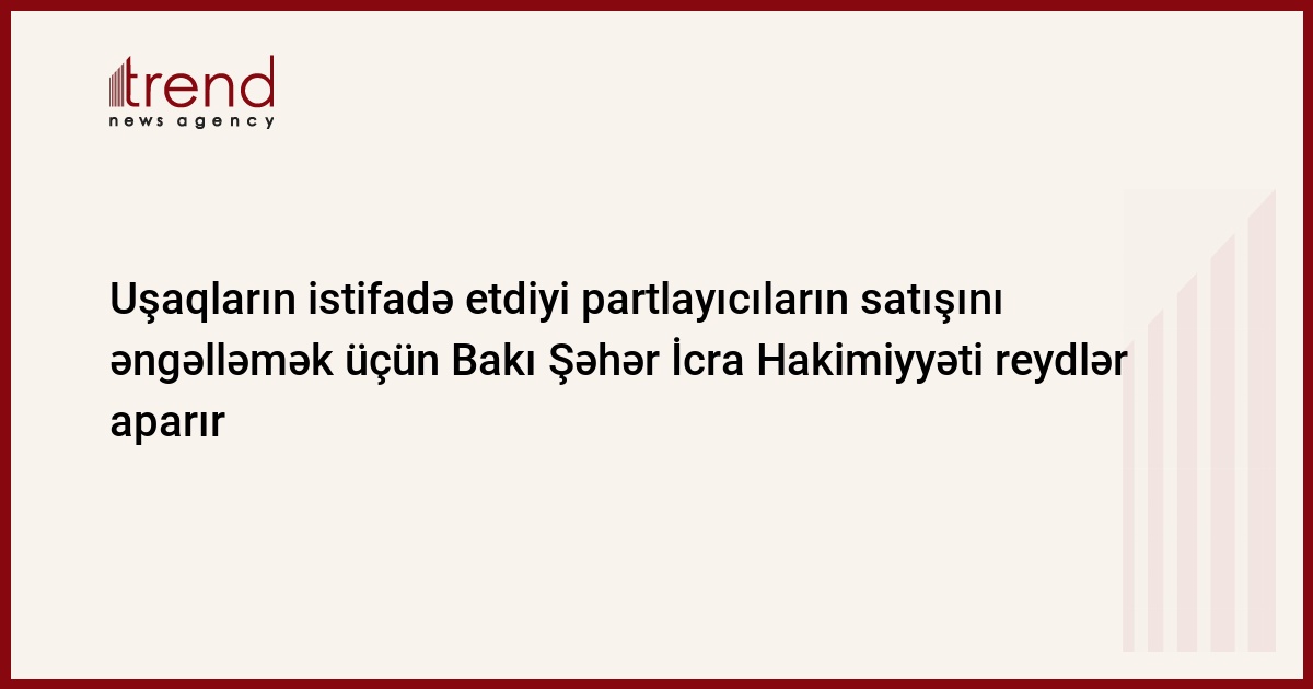 Yeni il bayramı ilə əlaqədar şəhərdə partlayıcıların (petarda) satışının qarşısını almaq üçün Bakı Şəhər İcra Hakimiyyətinin nəzarət qrupu fəaliyyətini davam etirir. Bu barədə Trend ə Bakı Şəhər Təsərrüfat və Xidmət İdarəsinin mətbuat xidmətinin rəhbəri Əliabbas Bağırov məlumat verib.