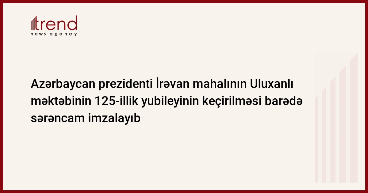 Azərbaycan prezidenti İlham Əliyev dekabrın 29-da İrəvan mahalının Uluxanlı məktəbinin 125-illik yubileyinin keçirilməsi barədə sərəncam imzalayıb, bu barədə Trend xəbər verir.