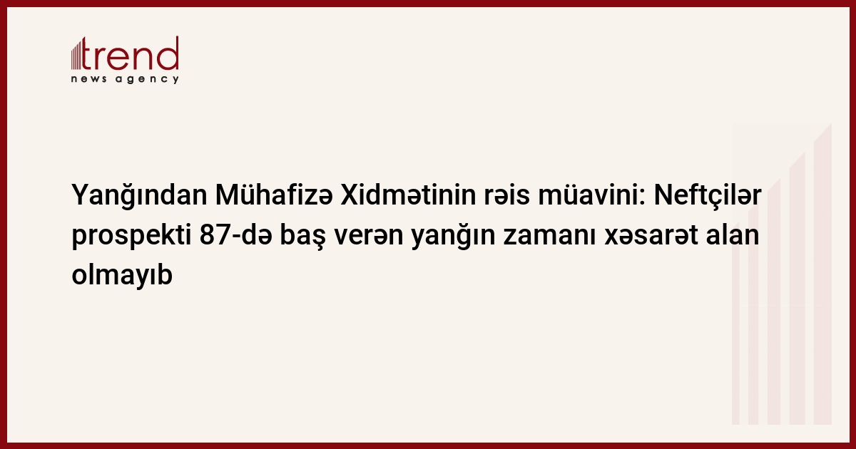 Yanvarın 12-də Bakıdakı Neftçilər prospekti, 87 saylı ünvanda yerləşən binanın 4-cü mərtəbəsində baş vermiş yanğın nəticəsində xəsarət alan olmayıb. Bu barədə Trend ə hadisə yerində olan Baş Dövlət Yanğından Mühafizə xidmətinin rəis müavini Rza Quliyev məlumat verib.