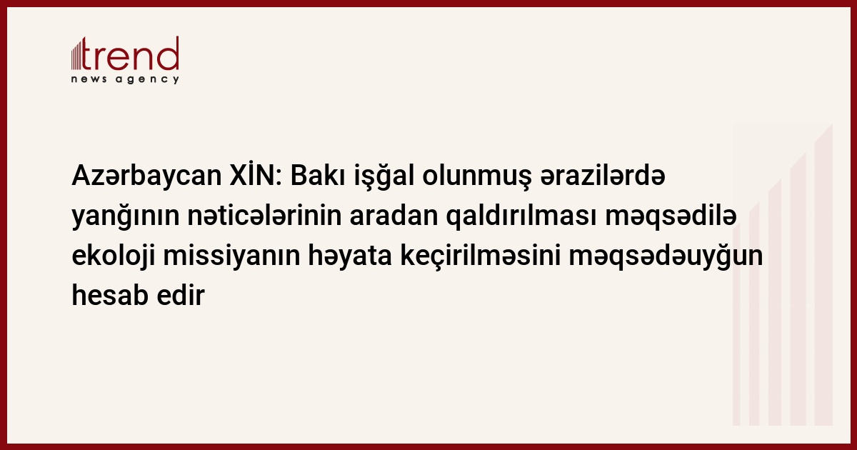 Rəsmi Bakı Azərbaycanın işğal olunmuş ərazilərində yanğının nəticələrinin aradan qaldırılması məqsədilə ekoloji missiyanın həyata keçirilməsini məqsədəuyğun hesab edir. Bu barədə Trend ə Azərbaycan XİN-in İnformasiya siyasəti və mətbuat idarəsinin birinci katibi Xəzər İbrahim məlumat verib.