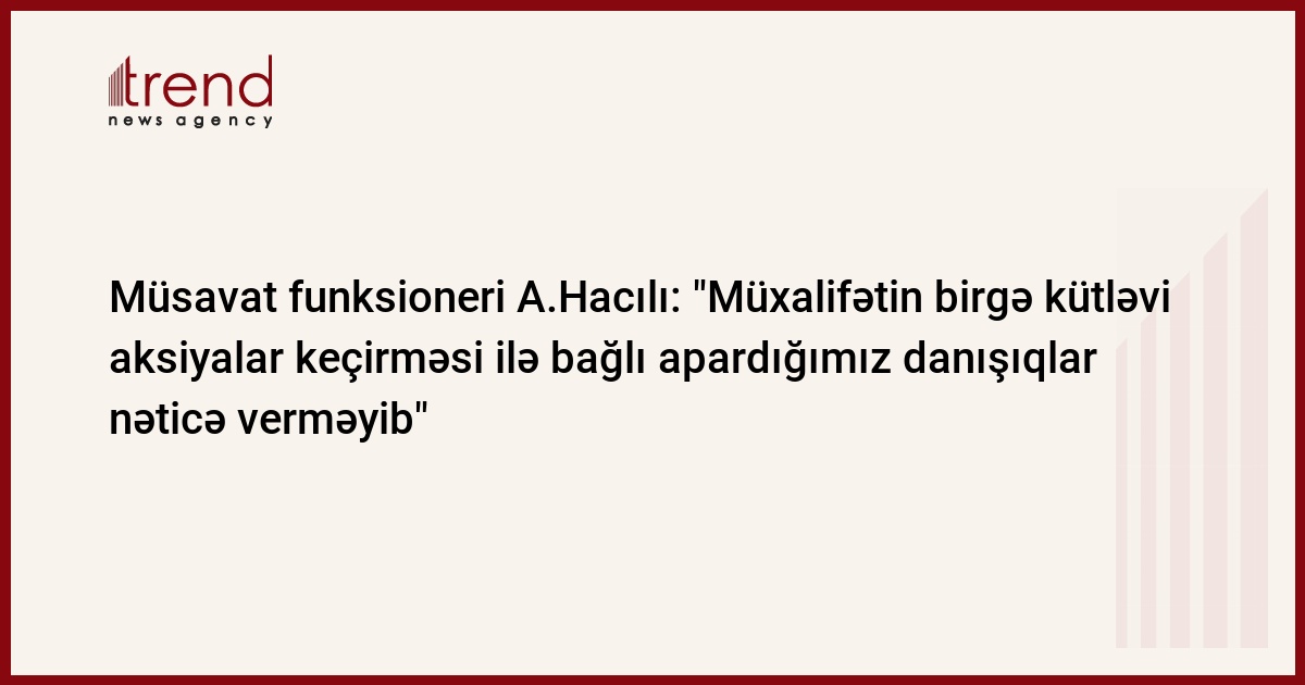 "Müxalifətin birgə kütləvi aksiyalar keçirməsi ilə bağlı apardığımız danışıqlar heç bir müsbət nəticə verməyib". Bu fikirləri Trend ə açıqlamasında Müsavat Partiyası mərkəzi icra aparatının rəhbəri Arif Hacılı bildirib.