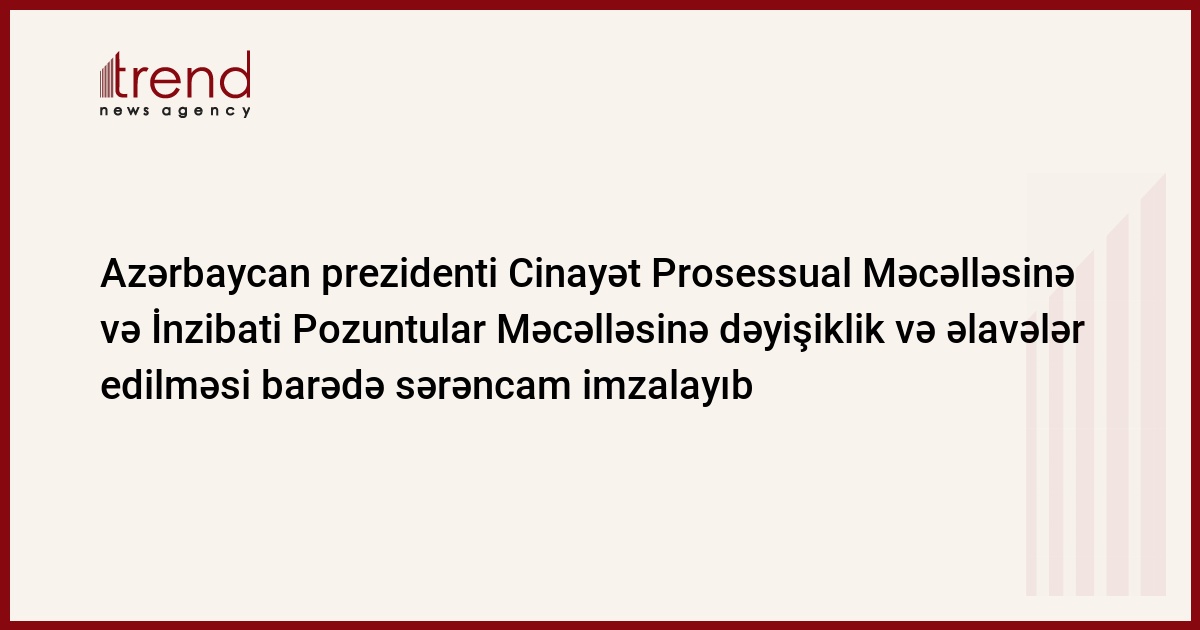 Trend xəbər verir ki, Azərbaycan prezidenti İlham Əliyev Cinayət Prosessual Məcəlləsinə və İnzibati Pozuntular Məcəlləsinə dəyişiklik və əlavələr edilməsi barədə sərəncam imzalayıb. Bu sərəncamla Azərbaycan Respublikasının "AR Cinayət Prosessual Məcəlləsinin təsdiqi, qüvvəyə minməsi və hüquqi tənzimlənməsi məsələləri haqqında" Qanuna, eləcə də "İnzibati Cəzalar Məcəlləsinin təsdiqi, qüvvəyə minməsi və hüquqi tənzimlənməsi məsələləri haqqında" Qanuna dəyişiklik və əlavələr edilir.