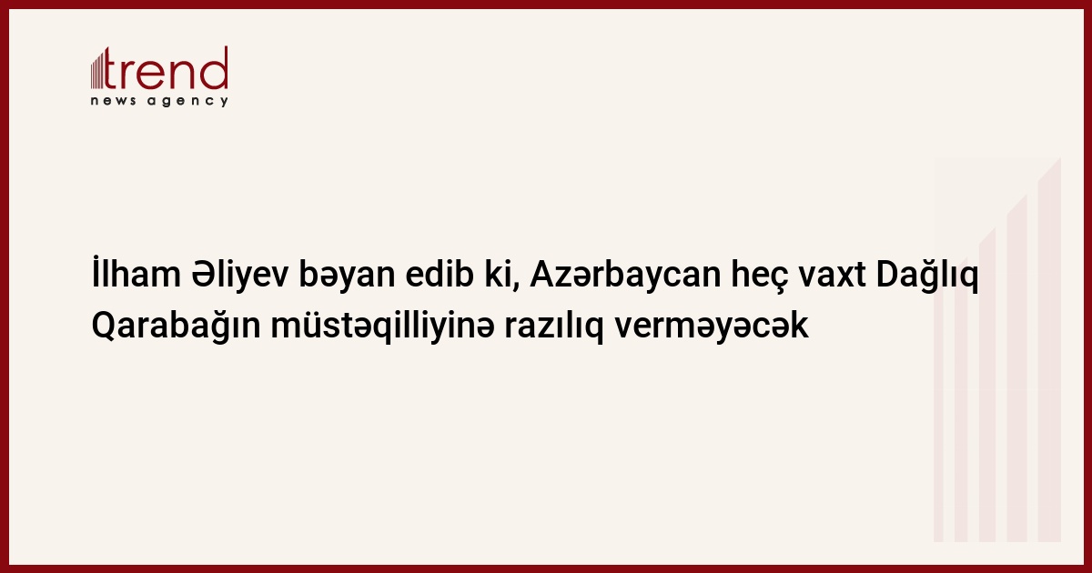 Azərbaycan heç vaxt Dağlıq Qarabağın müstəqilliyinə razılıq verməyəcək. Bu barədə bu gün Parisə səfəri başlayan Azərbaycan prezidenti İlham Əliyev "Fiqaro" qəzetinə verdiyi müsahibəsində bildirib. Fransa Rusiya və ABŞ-la birgə Dağlıq Qarabağ münaqişəsinin nizamlanması üzrə vasitəçilik cəhdlərində iştirak edir.