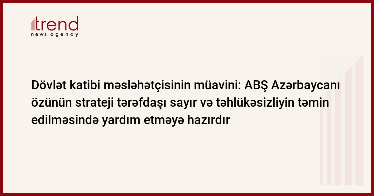 ABŞ Azərbaycanı özünün strateji tərəfdaşı sayır və təhlükəsizliyin təmin edilməsində yardım etməyə hazırdır. Trend xəbər verir ki, bu barədə ABŞ dövlət katibi məsləhətçisinin müavini Maykl Kolter bildirib.
