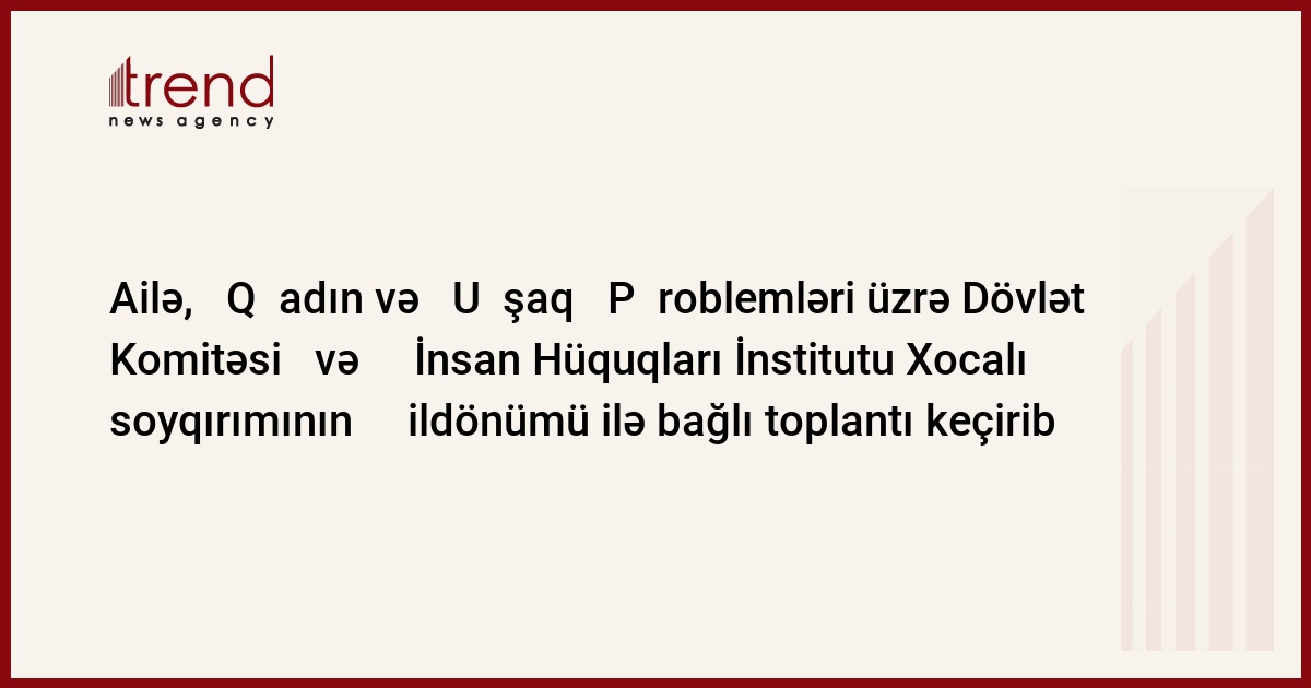 Azərbaycan, Bakı/ Trend müxbir S.İlhamqızı/ Fevralın 22-də Ailə, Qadın və Uşaq Problemləri üzrə Dövlət Komitəsi AMEA-nın İnsan Hüquqları İnstitutu ilə birgə Xocalı faciəsinin 15-ci ildönümü ilə bağlı geniş toplantı keçirib. Trend in məlumatına görə, toplantıda Gənclər və İdman naziri Azad Rəhimov, Türkiyənin Azərbaycandakı səfiri Hüseyn Avni Qarslıoğlu, Nazirlər Kabinetinin, Ədliyyə Nazirliyinin, Xarici İşlər Nazirliyinin, Milli Məclisin nümayəndələri, ziyalılar, QHT rəhbərləri iştirak ediblər.