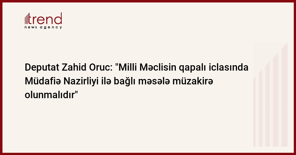 Azərbaycan, Bakı / Trend müxbir İ.Əlizadə/ Milli Məclisin qapalı iclasında Müdafiə Nazirliyi ilə bağlı məsələ müzakirə olunmalıdır. Bu barədə Milli Məclisin Müdafiə və Təhlükəsizlik məsələləri komissiyasının üzvü Zahid Oruc bildirib. Onun fikrincə, Müdafiə Nazirliyinin azərbaycanlı zabit Ramil Səfərova münasibəti ümumilikdə nazirliyin Azərbaycan əsgərinə münasibətinin göstəricisidir.