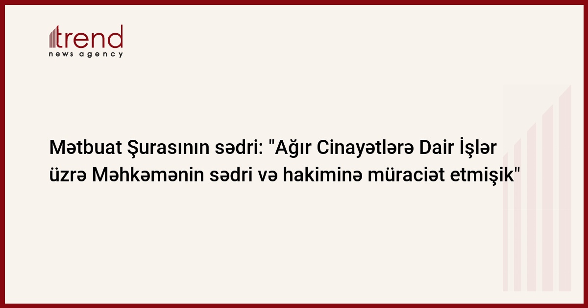 Azərbaycan, Bakı / Trend müxbir S.İlhamqızı/ Azərbaycan Mətbuat Şurası Ağır Cinayətlərə Dair İşlər üzrə Məhkəmənin sədri Mahmud Nəbiyev və hakimi Faiq Qasımova müraciət ünvanlayıb. Bu barədə Trend ə Mətbuat Şurasının sədri Əflatun Amaşov məlumat verib.