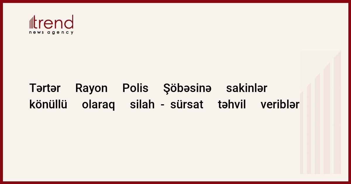 Azərbaycan, Bərdə /müxbir Trend Ş.Cəliloğlu/ Tərtər rayon polis şöbəsinin apardığı profilaktik tədbirlər nəticəsində sakinlərdən könüllü olaraq silah-sürsat yığılıb. Rayon polis şöbəsinin rəis müavini Məhərrəm Əliyevin verdiyi məlumata görə, əhalidən 5 ədəd avtomat, 3 ədəd od tüfəngi, 1 ədəd lülləyi və qundağı kəsilmiş beşatılan, 3 ədəd qumbara, 2 ədəd müxtəlif markalı tapança, 2 ədəd işıqlandırıcı və tüstüləyən partlayıcı, 1 ədəd pulemyot qatarı, 4 mindən çox müxtəlif silahların gülləsi sakinlərdən yığılıb. Bütün silah-sürsatlar Daxili İşlər Nazirliyinin aidiyatı idarələrinə göndəriləcək.