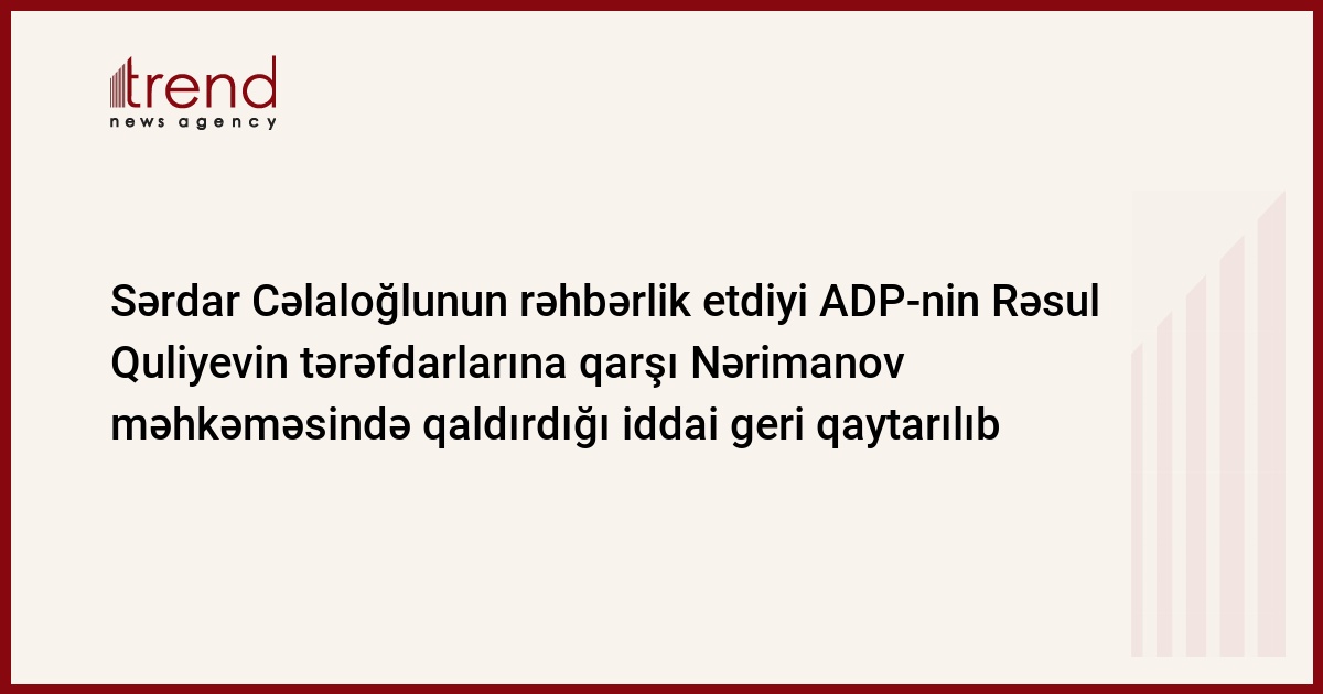 Azərbaycan, Bakı / Trend müxbir İ.Əlizadə/ Sərdar Cəlaloğlunun rəhbərlik etdiyi Azərbaycan Demokrat Partiyasının (ADP) qurultaya hazırlıq üzrə Təşkilat Komitəsinin Nərimanov rayon məhkəməsində partiyanın keçmiş üzvləri Akif Şahbazov, Aydın Quliyev, Zəminə Dünyamalıyeva, Yaqub Abbasov və digərlərinə qarşı qaldırdığı iddia geri qaytarılıb. Bu barədə ADP qurultaya hazırlıq üzrə Təşkilat Komitəsinin üzvü Taliyət Əliyev məlumat verib.