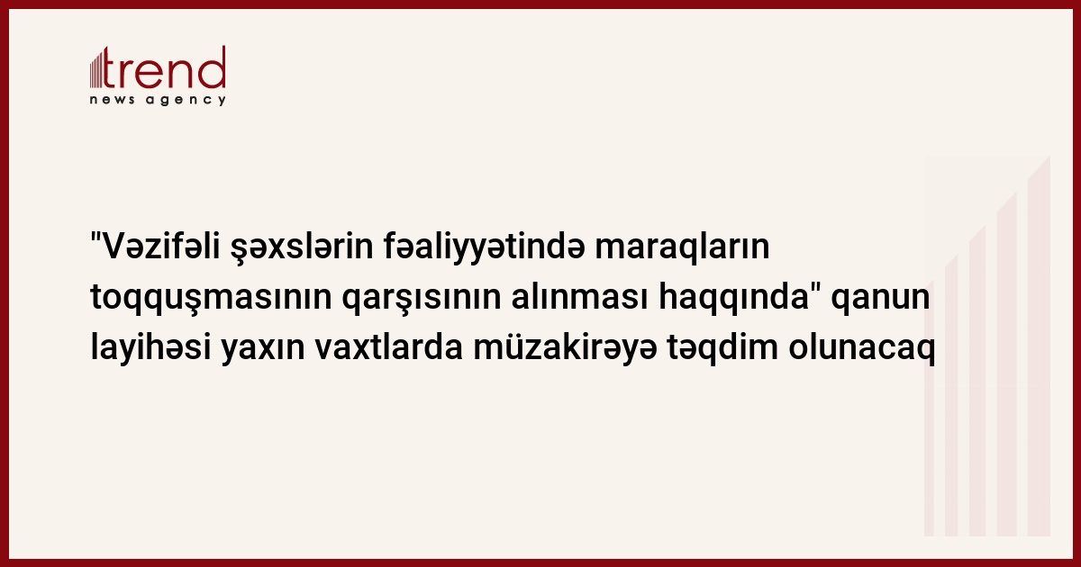 Azərbaycan, Bakı / Trend müxbir İ.Əlizadə/ Milli Məclisin İnzibati və hərbi qanunvericilik şöbəsində hazırlanan "Vəzifəli şəxslərin fəaliyyətində maraqların toqquşmasının qarşısının alınması haqqında" qanun layihəsi yaxın vaxtlarda müzakirəyə təqdim olunacaq. Bu barədə məlumat verən Milli Məclisin İnzibati və hərbi qanunvericilik şöbəsinin müdir müavini Səyyad Kərimov bildirb ki, yeni qanun layihəsi ekspertiza üçün Avropa Şurasına da göndərilib. Onun sözlərinə görə, artıq Avropa Şurası layihəyə rəy verib: "Hazırda Avropa Şurasının verdiyi rəy tərcümə olunur. Tərcümə prosesi başa çatandan sonra biz həmin rəyləri dərindən öyrənəcəyik və onlardan hansının qanun layihəsinə əvalə edilib-edilməyəcəyi müzakirələrdən sonra məlum olacaq."