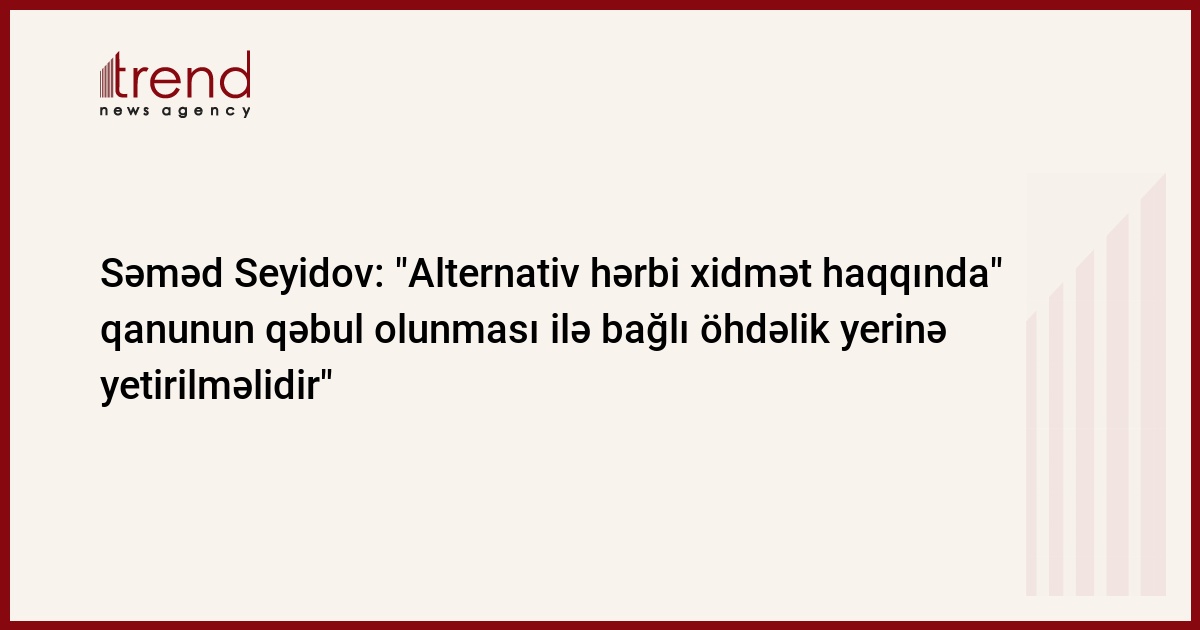 Azərbaycan, Bakı / Trend , müxbir İ.Əlizadə/ Azərbaycan Avropa Şurası qarşısında "Alternativ hərbi xidmət haqqında" qanunun qəbul olunması ilə bağlı öhdəlik götürüb və ona görə də bu öhdəlik yerinə yetirilməlidir. Bu barədə çərşənbə axşamı Bakıda Azərbaycanın Avropa Şurası Parlament Assambleyasındakı nümayəndə heyətinin rəhbəri, Milli Məclisin Beynəlxalq münasibətlər və parlamentlərarası əlaqələr daimi komissiyasının sədri Səməd Seyidov bildirib.