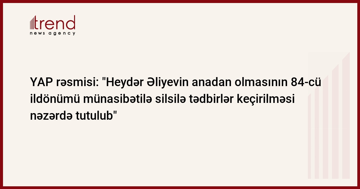 Azərbaycan, Bakı / Trend , müxbir İ.Əlizadə/ Hakim Yeni Azərbaycan Partiyasının (YAP) təşəbbüsü ilə eks-prezident Heydər Əliyevin anadan olmasının 84-cü ildönümü münasibətilə silsilə tədbirlər keçirilməsi nəzərdə tutulub. Bu barədə çərşənbə axşamı Bakıda YAP icra katibi, millət vəkili Əli Əhmədov məlumat verib.