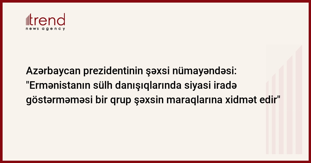 Azərbaycan, Bakı / Trend müxbir S.İlhamqızı/ Ermənistanın sülh danışıqları prosesində siyasi iradə nümayiş etdirməməsi bu ölkədəki bir qrup şəxsin maraqlarına xidmət edir. İctimai Televiziya xəbər verir ki, bu barədə Azərbaycanın xarici işlər nazirinin müavini, Dağlıq Qarabağ münaqişəsi üzrə prezidentin şəxsi nümayəndəsi Araz Əzimov çərşənbə günü açıqlama verib.