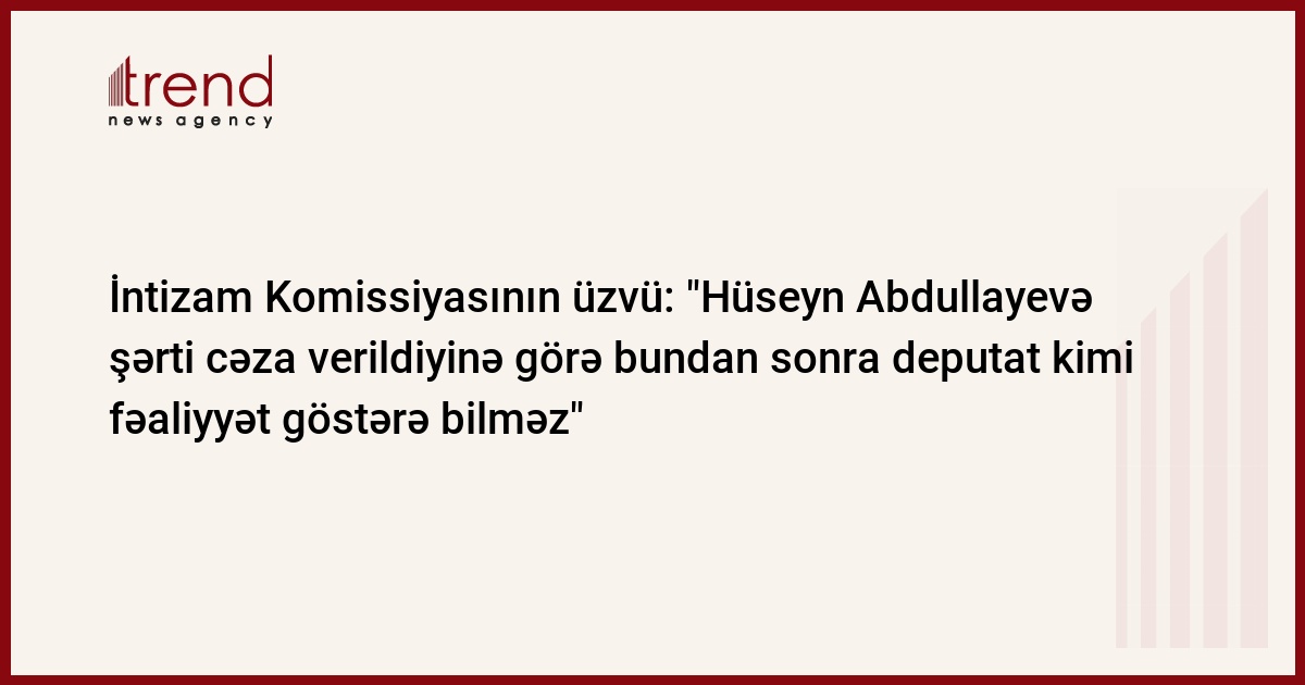 Azərbaycan, Bakı / Trend , müxbir İ.Əlizadə/ Hüseyn Abdullayevə şərti cəza verildiyinə görə o, bundan sonra deputat kimi fəaliyyət göstərə bilməz. Bu barədə cümə günü Bakıda Milli Məclisin İntizam Komissiyasının üzvü, millət vəkili Fazil Qəzənfəroğlu məlumat verib.