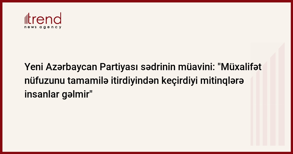 Azərbaycan, Bakı / Trend müxbir E.Hüseynli/Hakim Yeni Azərbaycan Partiyası sədrinin müavini, icra katibi Əli Əhmədov cümə günü bəyan edib ki, Azərbaycan müxalifəti nüfuzunu tamamilə itirdiyindən keçirdiyi mitinqlərə də insanları yığa bilmir. Onun sözlərinə görə, Azərbaycan müxalifətinin ən böyük səhvi hakimiyyətin taleyinin küçələrdə həll olunması iddiasında olmasıdır.