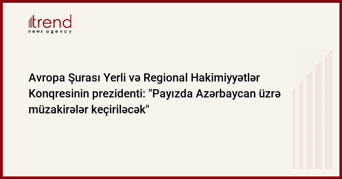 Fransa, Strasburq/ Trend müxbir A.İsmayılova/ Avropa Şurası Yerli və Regional Hakimiyyətlər Konqresinin payız sessiyasınada Azərbaycana tövsiyələr üzrə müzakirələr keçiriləcək. Bunu çərşənbə axşamı Strasbuqda azərbaycanlı jurnalistlərə Konqresin prezidenti Halvdan Skard bildirib. Konqres Azərbaycana 2002-ci ildə qoşulduğu Yerli özünü idarə haqqında Avropa Xartiyasına uyğun olaraq mer seçməyi tövsiyə edib. Hazırda Bakı şəhəri İcra Hakimiyyəti rəhbəri tərəfindən idarə olunur.