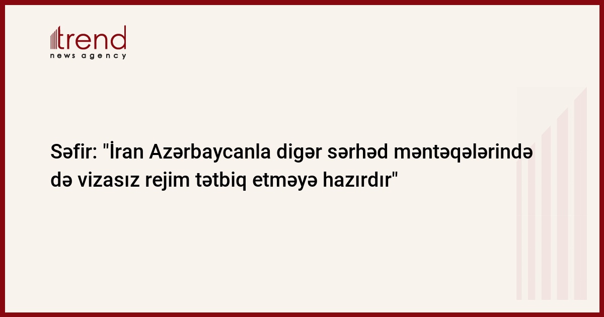 Azərbaycan, Bakı/ Trend müxbir E.Hüseynov/ Azərbaycan tərəfi razılıq verəcəyi təqdirdə İran Naxçıvan Muxtar Respublikası ilə olduğu kimi, Azərbaycanla həmsərhəd digər keçid məntəqələrində də vizasız rejim tətbiq etməyə hazırdır. Bu barədə bazar ertəsi mətbuat konfransında İran İslam Respublikasının Azərbaycandakı səfiri Nasir Həmidi Zare bildirib.