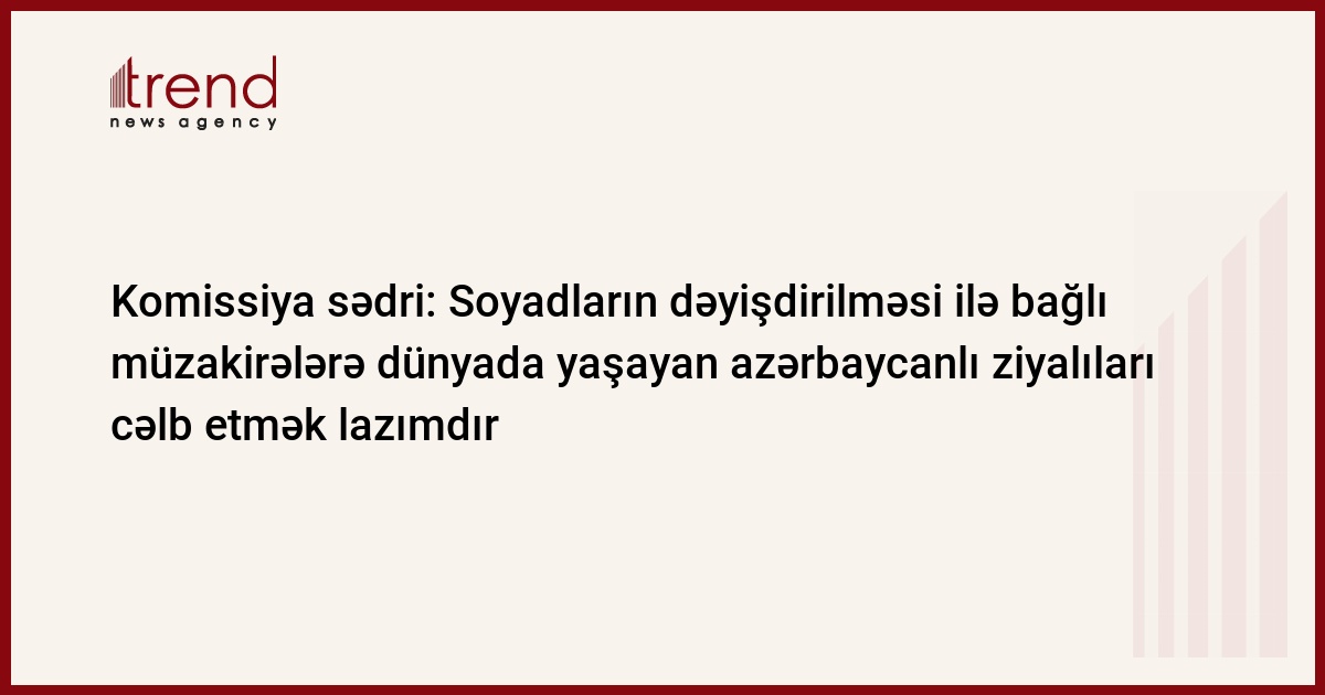 Azərbaycan, Bakı / Trend müxbir S.İlhamqızı/ Azərbaycanlıların soyadlarının sonluğunun dəyişdirilməsi barədə müzakirələrə bütün dünyada yaşayan azərbaycanlı ziyalıları cəlb etmək lazımdır. Bu barədə Milli Məclisin mədəniyyət məsələləri daimi komissiyasının sədri, professor Nizami Cəfərov cümə axşamı jurnalistlərə açıqlamasında bildirib.