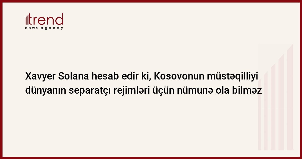 "Kosovo məsələsi elə bir məsələdir ki, digər regionların vəziyyətləri ilə müqayisə oluna bilməz" - deyə Solana Trend ə eksklüziv müsahibəsində bildirib.