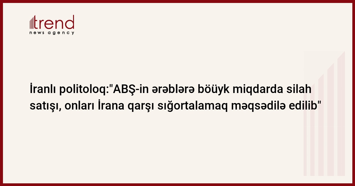 Azərbaycan, Bakı / Trend müxbir D.Xatınoğlu / ABŞ ərəb ölkələrinə bir çox miqdarda silah satması, onların İrana qarşı təhküləsizliyini təmin etmək və İsrail ilə sülh etmək təklifinin irəli sürülməsi məqsədilə edilib. Londonda fəaliyyət göstərən iranlı politoloq Əlirza Nurizadə hesab edir ki, ABŞ-in ərəblərə böüyk miqdarda silah satışı, onları İrana qarşı sığortalamaq məqsədi daşıyır. Bu barədə çərşənbə axşamı Trend ə telefon vasitəsi ilə Nurizadə məlumat verib.