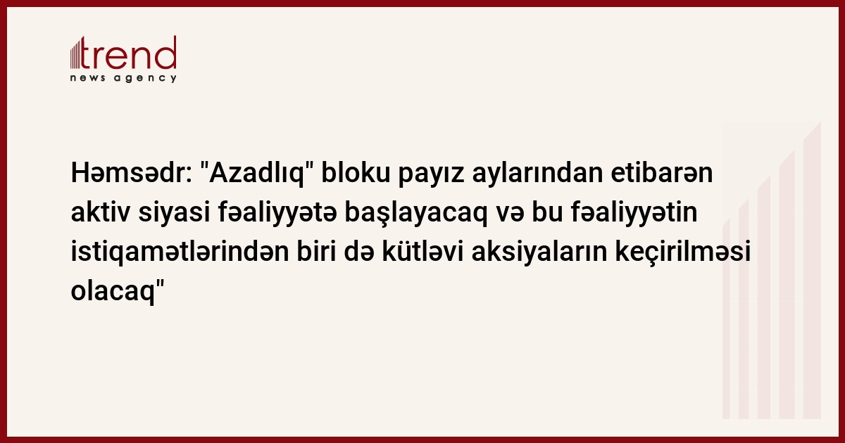 Son zamanlar siyasi arenada "Azadlıq" blokunun fəaliyyəti nəzərə çarpmır. Həmsədr bunun səbəblərinə aydınlıq gətirərkən qeyd edib ki, bu daha çox mövsümi xarakter daşıyır və havaların isti keçməsi ilə bağlıdır.