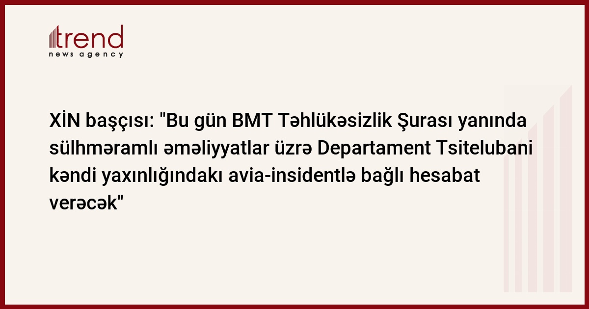 Gürcüstan, Tbilisi / Trend , müx. N.Kirtsxalia / BMT Təhlükəsizlik Şurası yanında sülhməramlı əməliyyatlar üzrə Departament bu gün Tsitelubani kəndi yaxınlığındakı avia-insidentlə bağlı hesabat verəcək. Bu barədə jurnalistlərə Gürcüstan hökumətinin iclasından öncə Gürcüstanın XİN başçısı Gela Bejuaşvili məlumat verib.