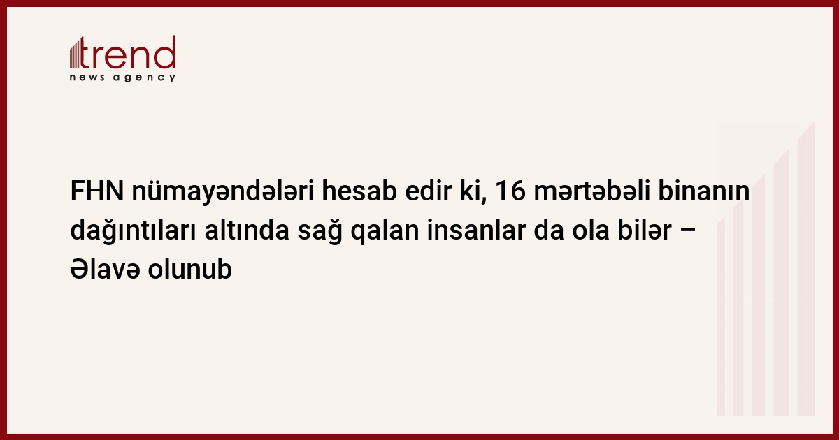 Azərbaycan, Bakı / Trend / İ.Əlizadə/ Fövqəladə Hallar Nazirliyinin nümayəndələri hesab edir ki, 16 mərtbəli binanın dağıntıları altında hələ də sağ insanlar ola bilər. Bu barədə jurnalistlərə cümə axşamı Nazirliyin xilasetmə xidmətinin rəisi Cahangir Qulamov məlumat verib.