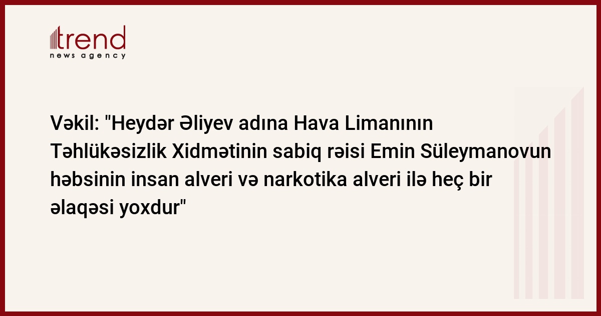 Azərbaycan, Bakı/ Trend , müxbir K.Zərbalıyeva/ Heydər Əliyev adına Hava Limanının Təhlükəsizlik Xidmətinin sabiq rəisi Emin Süleymanovun həbsinin insan alveri və narkotika alveri ilə heç bir əlaqəsi yoxdur. Bunu çərşənbə günü Trend ə açıqlamasında Süleymanovun vəkili Rza İbadov deyib.