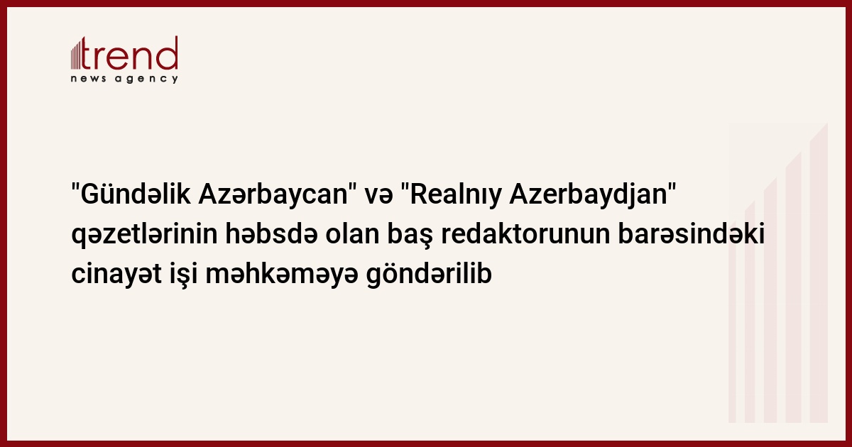 Azərbaysan, Bakı / Trend , müxbir K. Zərbalıyeva / "Gündəlik Azərbaycan" və "Realnıy Azerbaydjan" qəzetlərinin həbsdə olan baş redaktorunun barəsindəki cinayət işi məhkəməyə göndərilib. Trend in məlumatına görə, bu barədə baş redaktor Eynulla Fətullayevin vəkili İsaxan Aşurov məlumat verib. Cinayət işinə Ağır Cinayətlərə Dair işlər üzrə Məhkəmədə baxılacaq.