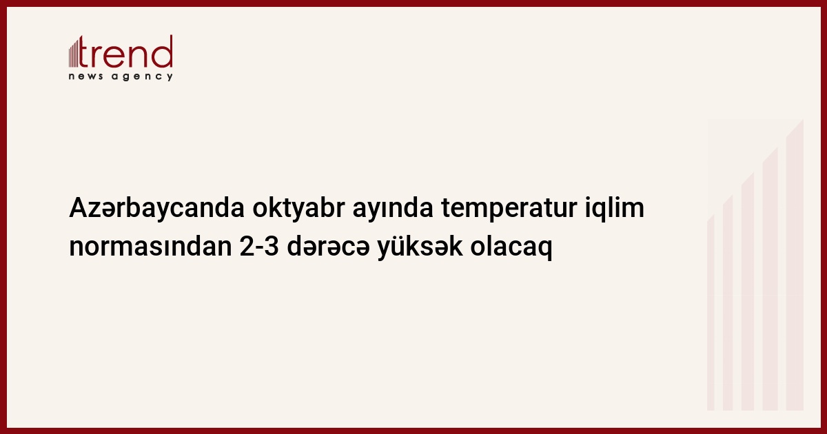 Azərbaycan, Bakı / Trend müxbir E.Hüseynli/ Azərbaycanda oktyabr ayında havanın orta aylıq temperaturu iqlim normasından 2-3 dərəcə yüksək olacaq, bazar ertəsi Trend ə açıqlamasında Ekologiya və Təbii Sərvətlər Nazirliyinin Milli Hidrometeorologiya Departamentinin direktor müavini Umayra Tağıyeva bildirib. Onun sözlərinə görə, hesabat dövründə yağıntıların miqdarı iqlim normasına yaxın, Böyük Qafqazın bəzi rayonlarında isə normadan bir qədər çox olacağı proqnozlaşdırılır.