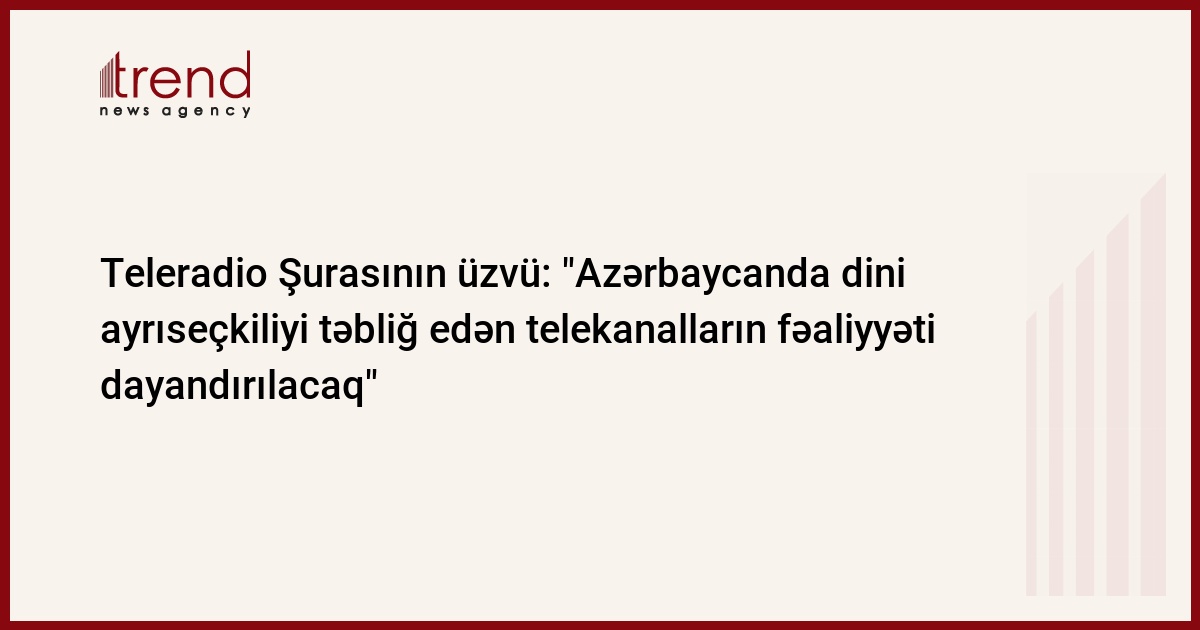 Azərbaycan, Bakı / Trend müxbir E.Hüseynli/ Azərbaycanda dini və irqi ayrıseçkiliyi təbliğ edən telekanalların fəaliyyəti dayandırılacaq, çərşənbə axşamı Trend ə Milli Televiziya və Radio Şurasının (MTRŞ) üzvü Qafar Cəbiyev bildirib. Onun sözlərinə görə, bununla bağlı telekanalların rəhbərlərinə məlumat verilib.