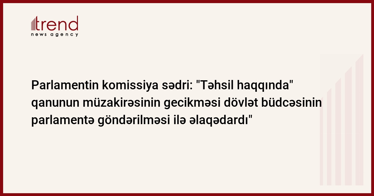 Azərbaycan, Bakı/ Trend müxbir İ.Əlizadə/ "Təhsil haqqında" yeni qanun layihəsinin Milli Məclisdə müzakirəsinin gecikməsi 2008-ci ilin dövlət büdcəsinin parlamentə göndərilməsi ilə əlaqədardır. Bu barədə çərşənbə axşamı jurnalistlərə açıqlamasında Milli Məclisin Elm və təhsil məsələləri daimi komisiyasının sədri, deputat Şəmsəddin Hacıyev məlumat verib.