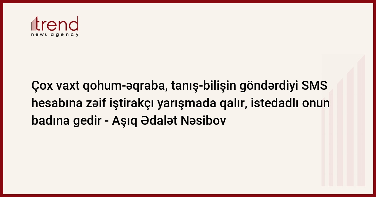 Öyrəndik ki, təşkilatçılar Nəsibovu münsifliyə bir ağsaqqal kimi dəvət ediblər. Özünü aşıq sənətinin şahı sayan ustad sənətkar da bu dəvətdən imtina edə bilməyib. Sən demə, iştirakçılar arasında Aşıq Ədalətin yetirməsi də varmış; Aşıq Xanların oğlu Aşıq Azər Xanlar. Bununla belə, ustad sənətkar iştirakçılar arasında ayrı-seçkilik salmır, hamısına eyni gözlə baxdığını deyir. Özünün favoriti də var, amma "əsas seçim xalqın ixtiyarındadır"-deyir. Ümumiyyətlə, aşıqdan olsaydı, qalibin SMS vasitəsiylə seçilməsinə razı olmazdı. Amma deyir ki, qayda-qanun belədir: "Çox vaxt qohum-əqraba, tanış-bilişin göndərdiyi SMS hesabına zəif iştirakçı yarışmada qalır, istedadlı onun badına gedir".