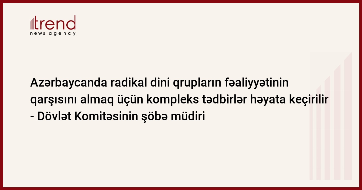 Azərbaycan, Bakı/ Trend müxbir E.Hüseynli/ Azərbaycanda vəhabi adı altında fəaliyyət göstərən radikal dini qruplara qarşı inzibati tədbirlər gücləndirilib. "Ölkədə mövcud olan radikal dini qrupların fəaliyyətinin qarşısını almaq üçün kompleks tədbirlər həyata keçirilir" çərşənbə axşamı Trend ə Dini Qurumlarla İş üzrə Dövlət Komitəsinin (DQİDK) dini qurumlarla iş üzrə şöbəsinin müdiri Gündüz İsmayılov bildirib.