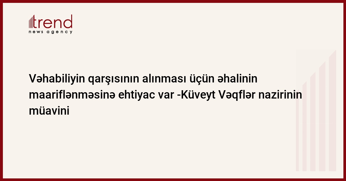 "Vəhabiliyin və ümümiyyətlə hər hansı bir radikallığın qarşısının alınmasının ən ideal üsulu əhalinin dini cəhətdən maarifləndirilməsidir" - deyə cümə axşamı Trend ə Küveyt Vəqflər nazirinin müavini Adil əl-Fəlah bildirib.