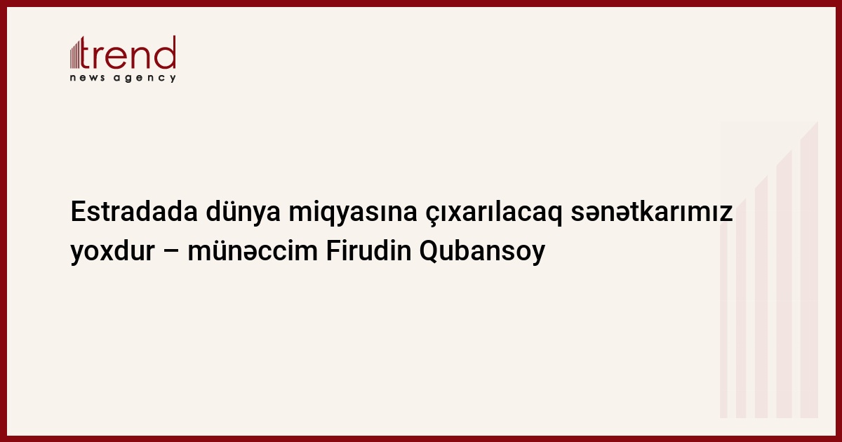 "Şərq təqvimi ilə yaşadığımız torpaq kəsəyəni ilində şou-biznes əhlinin işi təsəvvür etdiyimizdən də yaxşı gedəcək və tamaşaçıların beynini boş-boş işlərlə məşğul edəcəklər. Halbuki, əhalinin beynini düşündürəcək o qədər problem var ki, beyin artıq informasiyanı yükləməyə qadir deyil. Ancaq şou-biznes əhli bunu bacaracaq. Qeyd edim ki, builki təqvimin idarəedicisi "Zöhrə Səyyarəsi"dir. Yəni, Venera planetidir. Bu planet çalıb, oxumaqla, musiqi və eşq macəraları ilə yaddaqalandır. Kəsəyən isə elə bir xasiyyətə malikdir ki, onun üçün sərhəd yoxdur, istədiyini böyük həyasızlıqla əldə etməyə qadirdir. Bu parametrlərə uyğun gələn insanlar üçün geniş meydan açılacaq. Bir sözlə mədəniyyətdən, tərbiyədən bir qədər uzaq olan insanlar üçün bu təqvim düşərli olacaq" - bu sözləri TrendLife-a müsahibəsində AMEA-nın böyük elmi işçisi, filologiya elmləri namizədi, münəccim Firudin Qurbansoy şou-biznesin yaxın gələcəyini proqnoz edərkən dedi.