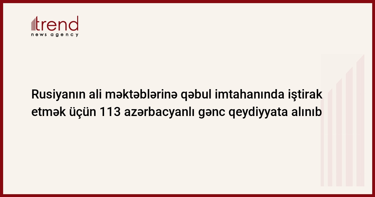 Azərbaycan, Bakı, 13 may / Trend , müxbir C.Babayeva/ Tələbə Qəbulu üzrə Dövlət Komissiyası (TQDK) Rusiyanın ali məktəblərinə qəbul imtahanında iştirak etmək üçün 113 Azərbaycan gəncini qeydiyyatdan keçirib. Bu barədə Trend -a Dövlət Komissiyasından məlumat verilib.