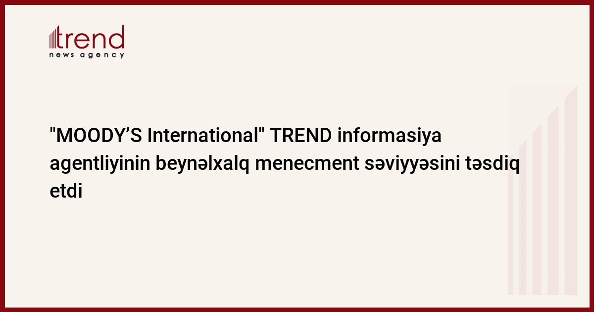 Azərbaycan, Bakı, 29 may / Trend / TREND informasiya agentliyi "Moody's International"dan agentliyin beynəlxalq menecment səviyyəsini, xəbərlər və multimediya məhsullarının beynəlxalq standartlara müvafiq olmasını təsdiq edən sertifikat alıb.