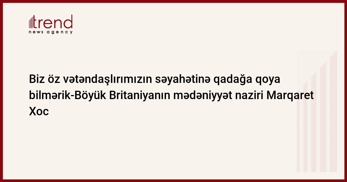 "Biz öz vətəndaşlarımızın səyahətinə qadağa qoya bilmərik. Biz Azərbaycanın bütövlüyünü tanıyırıq və bütün rəsmi sənədlərdə Azərbaycanın işğal olunmuş ərazilərini göstəririk. Səyahət etmək arzusunda olan Britaniyalı vətəndaşlar bunu çox gözəl bilirlər,-deyən Böyük Britaniyanın mədəniyyət və turizm naziri Marqaret Xoc söyləyib. Bu haqda TrendLife-a Mədəniyyət və turizm nazirliyinin mətbuat katibi İntiqam Hümbətov xəbər verib. M. Xoc tərəfindən deyilən bu sözlər nazirliyə göndərilən məktubda yazılıb. Xatırladaq ki, bu ilin martında İnternetdə işğal olunmuş ərazidə, Azıx mağarasında Böyük Britaniya və İspaniya arxeoloqları tərəfindən qazıntılar aparılır kimi xəbərlər yayılmışdı. Bununla əlaqədar Mədəniyyət və turizm nazirli Böyük Britaniyanın və İspaniyanın mədəniyyət və turizm nazirliyinə bu işlə əlaqədar rəsmi olaraq məktub göndərmiş, narahat olduqlarını bildirmişlər.