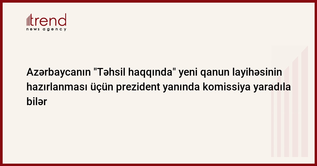 Azərbaycan, Bakı, 18 iyun/ Trend , müxbir İ.Əlizadə/ Azərbaycanın "Təhsil haqqında" yeni qanun layihəsinin hazırlanması üçün prezident İlham Əliyevin yanında komissiya yaradıla bilər. "Əgər "Təhsil haqqında" yeni qanun layihəsinin hazırlanması üçün prezident İlham Əliyevin yanında komissiyanın yaradılması təklifi ölkənin təhsil ictimaiyyətini qane edirsə və aktualdırsa bu təklifə baxıla bilər", - deyə Trend -a açıqlamasında Azərbaycan Prezidenti İcra Aparatının ictimai-siyasi şöbəsinin müdiri Əli Həsənov bildirib.