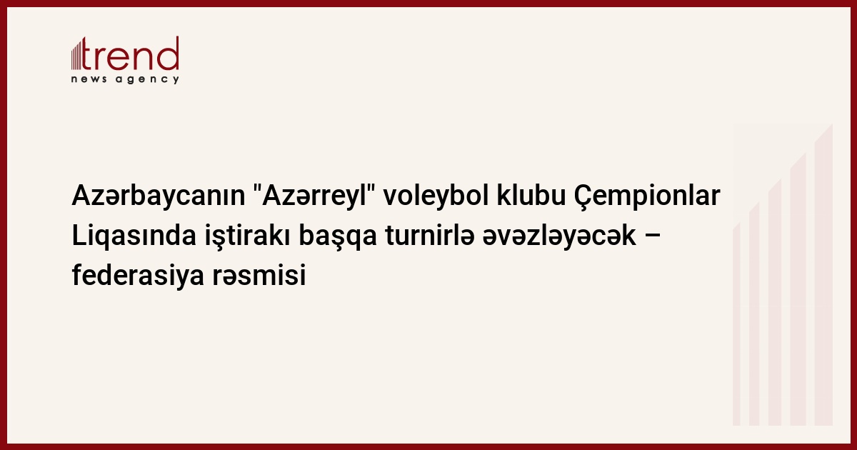 Azərbaycan, Bakı, 27 iyun / Trend , müxbir R.Ergün/ Azərbaycanın "Azərreyl" voleybol klubu Avropa Çempionlar Liqasında iştirak etməyəcək. Bu barədə cümə günü Trend -a Azərbaycan Voleybol Federasiyasının (AVF) mətbuat xidmətinin rəhbəri Zöhrab Gözəlbəyli deyib.