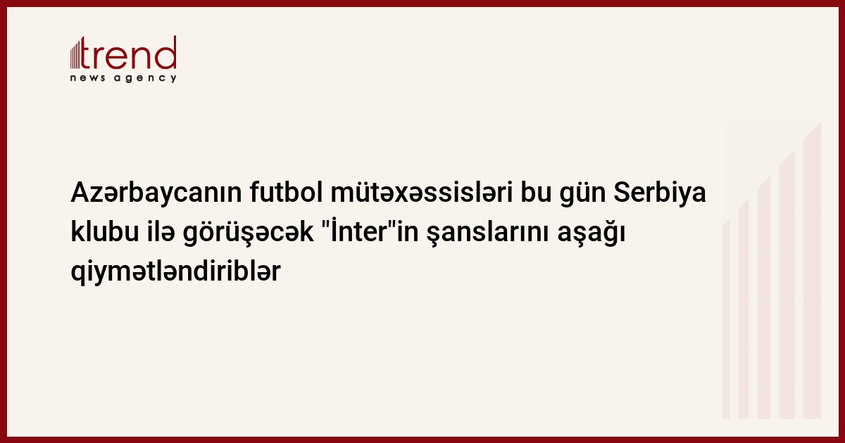 Azərbaycan, Bakı 29 iyul / Trend , müxbir R.Ergün/ Azərbaycanın "İnter" futbol klubunun Çempionlar Liqası çərçivəsində Serbiyanın "Partizan" komandası ilə görüşdə yeganə üstünlüyü oyunun Bakıda keçirilməsidir. Çərşənbə axşamı Trend -un keçirdiyi sorğuda iştirak edən futbol mütəxəssisləri "İnter" - "Partizan" oyunundan əvvəl hər iki komandanın şanslarını qiymətləndiriblər.