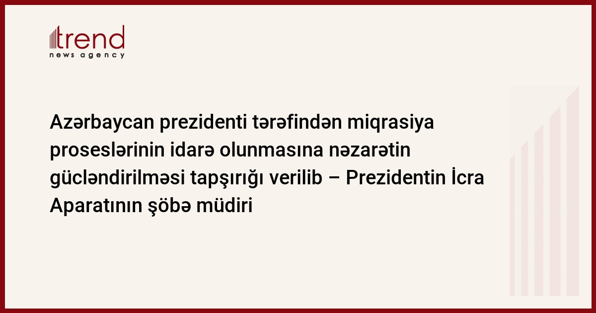 Azərbaycan, Bakı / Trend / Azərbaycan prezidenti İlham Əliyev miqrasiya sahəsində dövlət siyasəti, bu sahədə idarəetmə sisteminin təkmilləşdirilməsi məsələlərinə xüsusi diqqət ayırır. Bu barədə cümə günü Trend a Prezidentin İcra Aparatı hüqüq-mühafizə orqanları ilə iş üzrə şöbəsinin müdiri Fuad Ələsgərov bildirib.