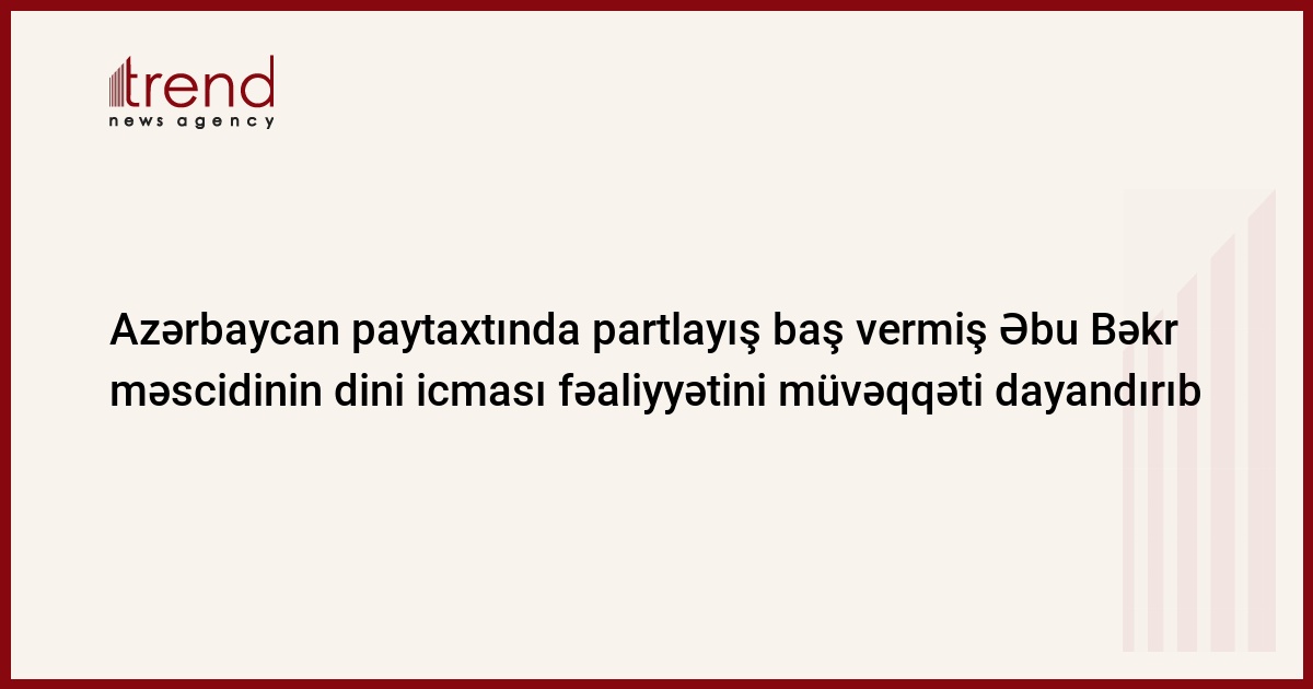 Azərbaycan, Bakı, 11 sentyabr / Trend , müxbir İ.Əlizadə/ Azərbaycan paytaxtında partlayış baş vermiş Əbu Bəkr məscidinin dini icması fəaliyyətini müvəqqəti dayandırıb.