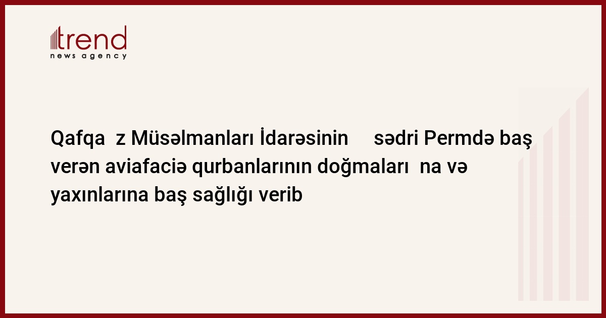 Azərbaycan, Bakı, 15 sentyabr/ Trend , müxbir R.Novruzov/ Qafqaz Müsəlmanları İdarəsinin rəhbəri Permdə baş verən aviafaciə qurbanlarının doğmaları və yaxınlarına, o cümlədən bütün Azərbaycan xalqına baş sağlığı verib. "Perm aviafaciəsi və o cümlədən də həmvətənlərimiz arasında olan çox sayda qurbanlar haqqında xəbər bizi sarsıdıb. Həlak olanların doğmaları və yaxınlarına, bütün Azərbaycan xalqına səmimi başsağlığımı bildirirəm", - Qafqaz Müsəlmanları İdarəsinin rəhbəri şeyxülislam Hacı Allahşükür Paşazadə öz mür a ciətində qeyd edib.