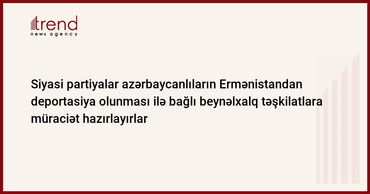 Azərbaycan, Bakı, 04 dekabr / Trend , müxbir İ.Əlizadə / Azərbaycan parlamentində təmsil olunan siyasi təşkilatlar hesab edirlər ki, azərbaycanlıların Ermənistandan deportasiya olunmasına siyasi və hüquqi qiymət verilməsi üçün beynəlxalq təşkilatlara müraciət edilməlidir.