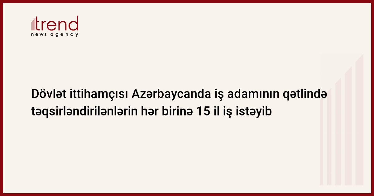 Azərbaycan, Bakı, 19 fevral / Trend , müxbir K.Zərbalıyeva/ Dövlət ittihamçısı bərdəli iş adamı Rza Təhməzovun qətlində təqsirləndirilənlərin hər birinə dövlət ittihamçısı 15 il iş istəyib.