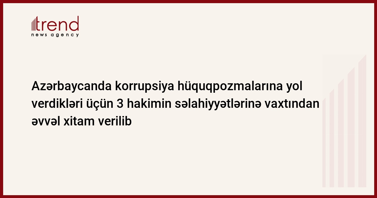 Azərbaycanda korrupsiya hüquqpozmalarına yol verdikləri üçün 3 hakimin səlahiyyətlərinə vaxtından əvvəl xitam verilib.